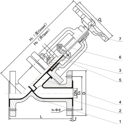 部件列表: 1.閥體 2.閥體襯里 3.閥蓋 4.閥瓣 5.壓蓋子 6.閥桿 7.手輪