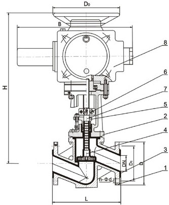 1.閥體 2.閥蓋 3.閥體襯里 4.閥瓣 5.壓蓋子 6.連接板 7.閥桿 8.電動裝置