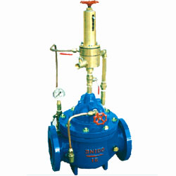 500X泄壓持壓閥由主閥、泄壓/持壓導閥針閥、球閥、微形過濾器和壓力表組成水力控制接管系統(tǒng)。利用水力自動操作,即可以作泄壓閥用又可作持壓閥用。作泄壓閥用時,可維持供水路壓力在設定的安全值之下;做持壓閥用,可維持主閥上游水壓在設定值之上,保持主閥上游供水壓力。