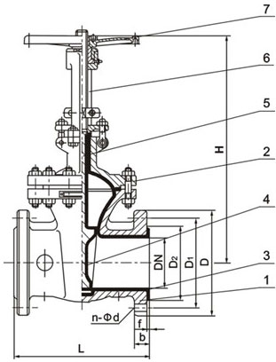 1.閥體 2.閥蓋 3.閥體襯里 4.閘板 5.閥桿 6.支架 7.手輪