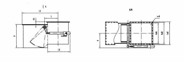 扇形閘門由本體、扇形閘板、軸、密封副、執行機構等部件構成。手動或執行機構推動搖桿使扇形閘板沿軸心旋轉開啟,物料隨即下落。待接料裝置滿載后再推動搖桿使扇行閘板復位,關閉截斷下落的物料。